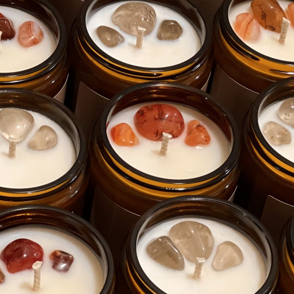 Diving right in I started exploring all the different methods of candle creation, finding that I enjoyed the flexibility in using different waxes, vessels, additives, and molds to create many different styles both new and old! It kept me and my customers excited, and so I decided to open up my business to make it more custom work inclined. Slowly but surely my portfolio grew, and now I can confidently offer a wide variety of candle making services tailored to my clients needs. Be it an intentional crystal candle or melt, a delicious and decorative dessert candle, center pieces for your big event, or a 100% natural and hypoallergenic pillar candle for that one friend who’s sensitive – I’m your maker!